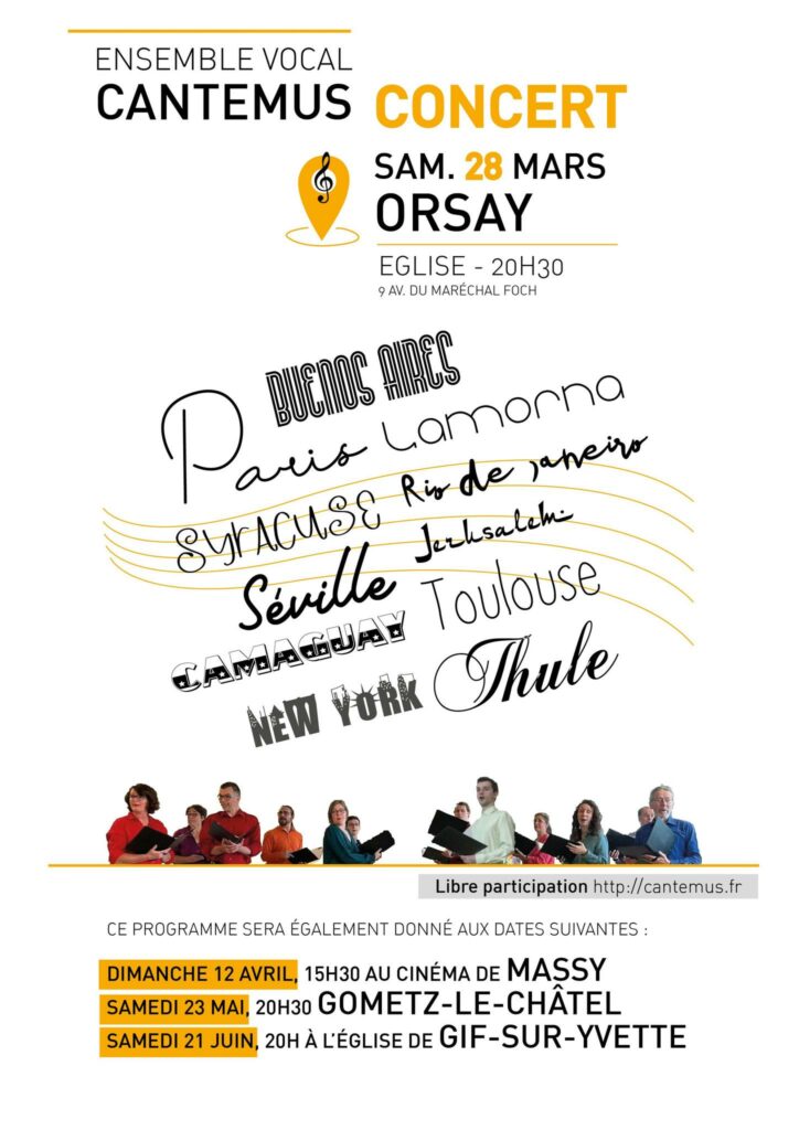 La ville sera donc le fil conducteur du programme 2026 de Cantemus. Ses douze chanteurs a cappella vous emmènent dans le cœur de Buenos aires, sous le ciel de Dreux, dans les embouteillages de Paris, sur la 5ème avenue de New-York, dans le port de Camaguay, chez le barbier de Séville… Vous reconnaîtrez peut-être quelques chansons connues réarrangées pour la musique vocale mais vous pourrez également découvrir des œuvres plus insolites et des créations.